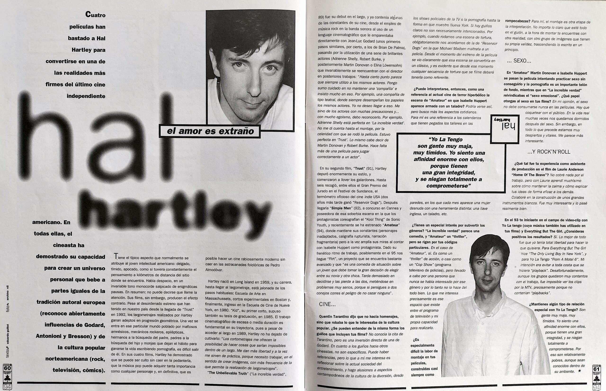 Tiene el típico aspecto que normalmente se atribuye al joven intelectual americano: delgado, tímido, apocado, como si tuviera constantemente el pensamiento a kilómetros de distancia del sitio donde se encuentra. Habla despacio, en un invariable tono monocorde salpicado de enigmáticas pausas. En resumen: no puede decirse que llame la atención. Sus films, sin embargo, producen el efecto contrario. Pese al desordenado estreno que han tenido en nuestro país desde la llegada de Trust en 1992, los largometrajes realizados por Hartley ganan adeptos en progresión geométrica. Una vez se entra en ese particular mundo poblado por mafiosos amnésicos, mecánicos rockeros, epilépticas, hermanos a la búsqueda del padre, padres a la búsqueda del hijo y monjas que dejan el hábito para ganarse la vida escribiendo pornografía, es difícil salir de él. En sus cuatro films, Hartley ha demostrado que se puede ser culto sin caer en la pedantería, que la música pop puede adquirir tanta importancia como cualquier personaje y, en definitiva, que es posible hacer un cine moderno sin caer en las astracanadas folclóricas de Pedro Almodóvar.