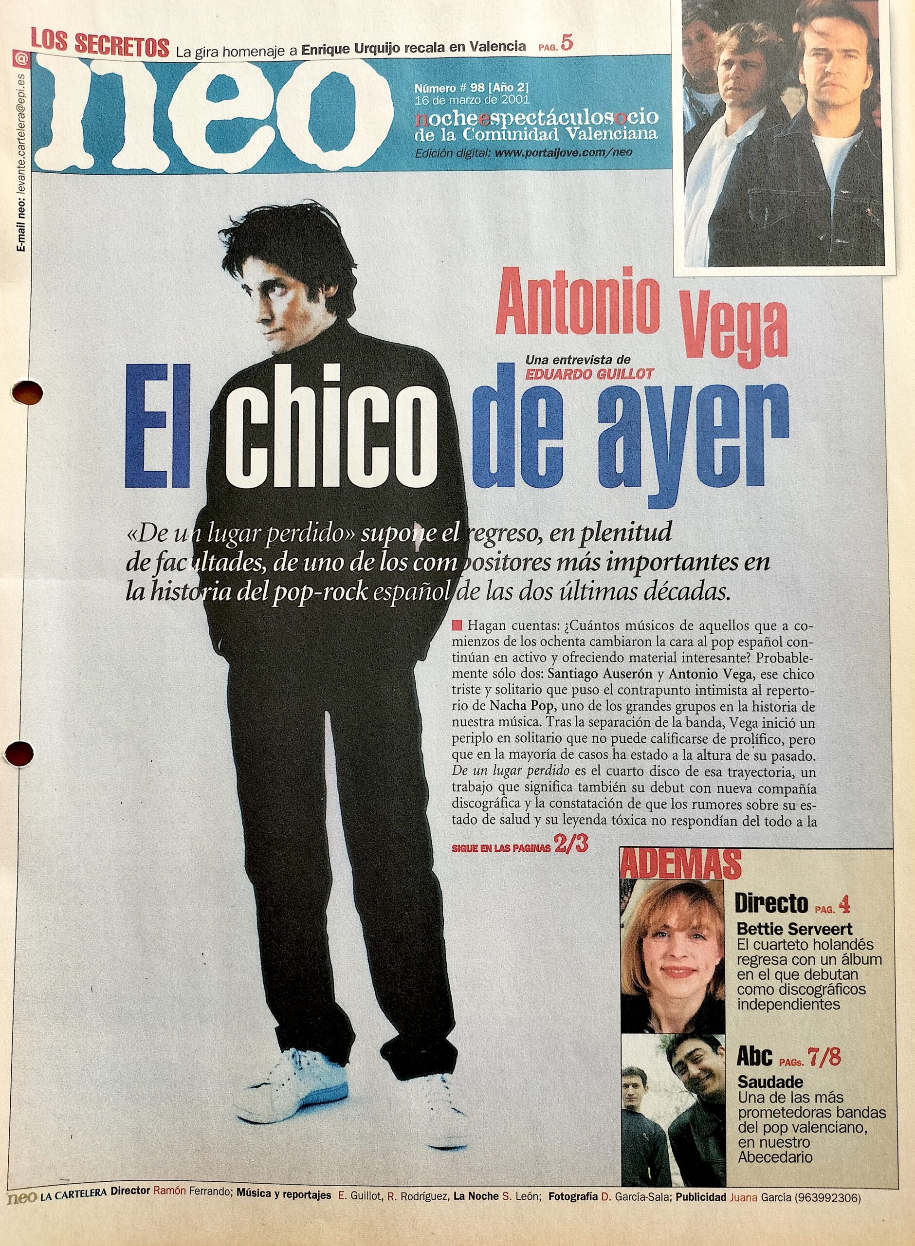 No fue el caso de Antonio Vega, con quien solo tengo recuerdo de haberlo hecho un par de veces, y además muy separadas en el tiempo. De la primera ni siquiera he podido localizar la fecha, pero debió ser en torno a 1986/87, coincidiendo con una visita de los todavía en activo Nacha Pop a la discoteca Espiral de L’Eliana. No es posible recuperarla porque nunca apareció publicada en papel, ya que su destino final fue la emisión radiofónica.